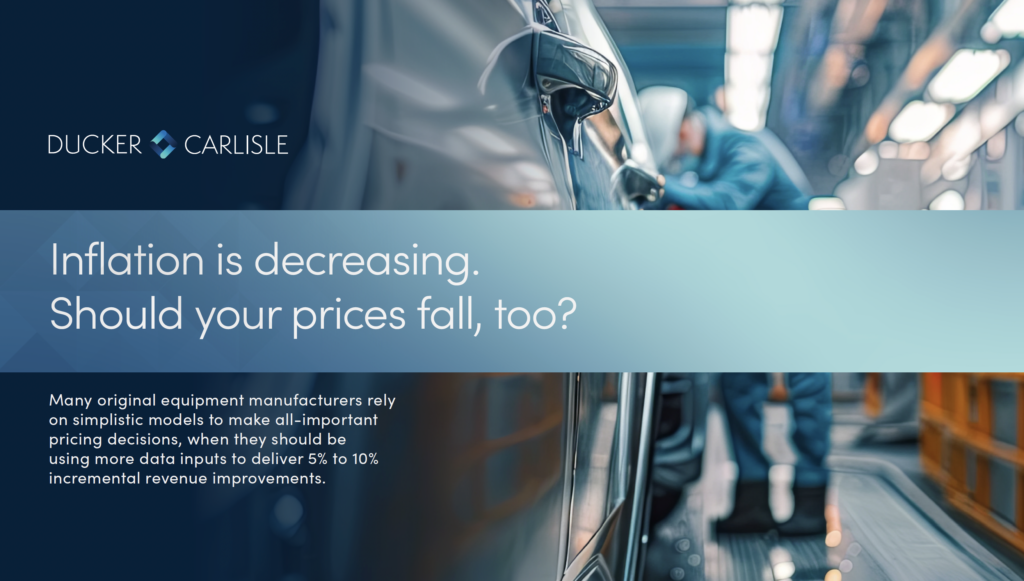 Most original equipment manufacturers are struggling to factor a wide mix of variables into their pricing strategies. From the costs of raw materials and supply chain issues to consumer sentiment and labor challenges, OEMs are grappling with a multitude of challenges. As the economy creeps out of pandemic disruptions, pricing strategies won’t get any easier. Decreasing inflation will lead customers to expect lower prices.