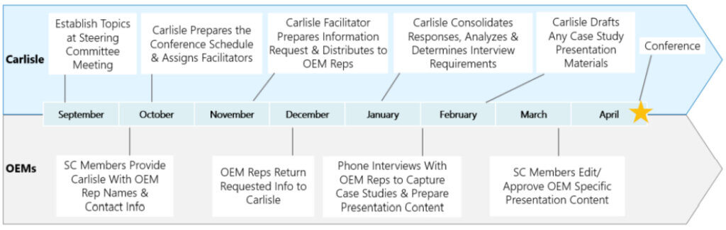Note that it is possible you may have been assigned the OEM Rep role for the conference, even if you were not the original OEM Rep on the topic. This is a common practice, as not all subject matter experts are able to attend the conference due to scheduling and travel conflicts. If this is the case for you, don’t worry! Your Carlisle facilitator will work with you to ensure you’re prepared for the conference discussion.